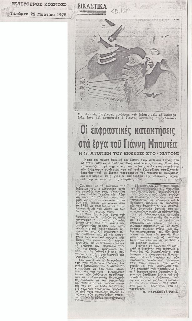 Φωτοαντίγραφο αποκόμματος, χαρτί, 28,5×10 εκ., όπου δημοσιεύεται, στα ελληνικά, κριτική του Μίλτη Παρασκευαΐδη για την ατομική έκθεση έργων του Γιάννη Μπουτέα στην Αθήνα τον Μάρτιο του 1972. Εικονογραφείται με αναπαραγωγή έργου. Επάνω, σημείωση, δακτυλόγραφη, στα ελληνικά, με τα στοιχεία της δημοσίευσης.