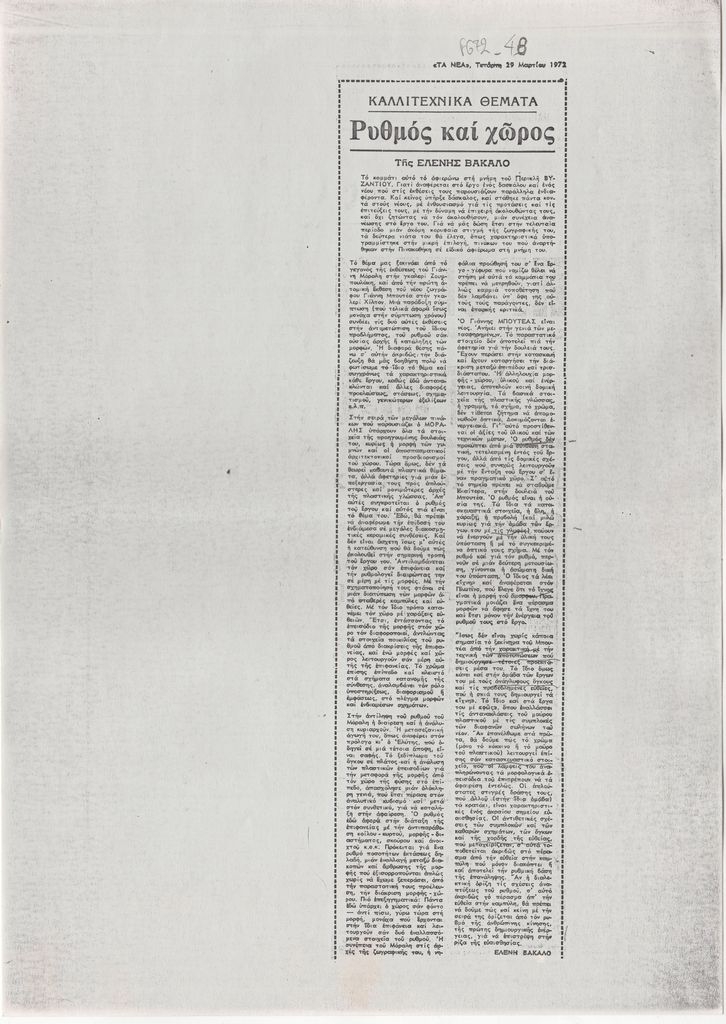 Φωτοαντίγραφο αποκόμματος, χαρτί, 26,0×7,3 εκ., όπου δημοσιεύεται, στα ελληνικά, κριτική της Ελένης Βακαλό για την ατομική έκθεση έργων του Γιάννη Μπουτέα στην Αθήνα τον Μάρτιο του 1972. Εντάσσεται στη στήλη “Καλλιτεχνικά θέματα”. Επάνω, δακτυλόγραφη επιγραφή, στα ελληνικά, με τα στοιχεία της δημοσίευσης.