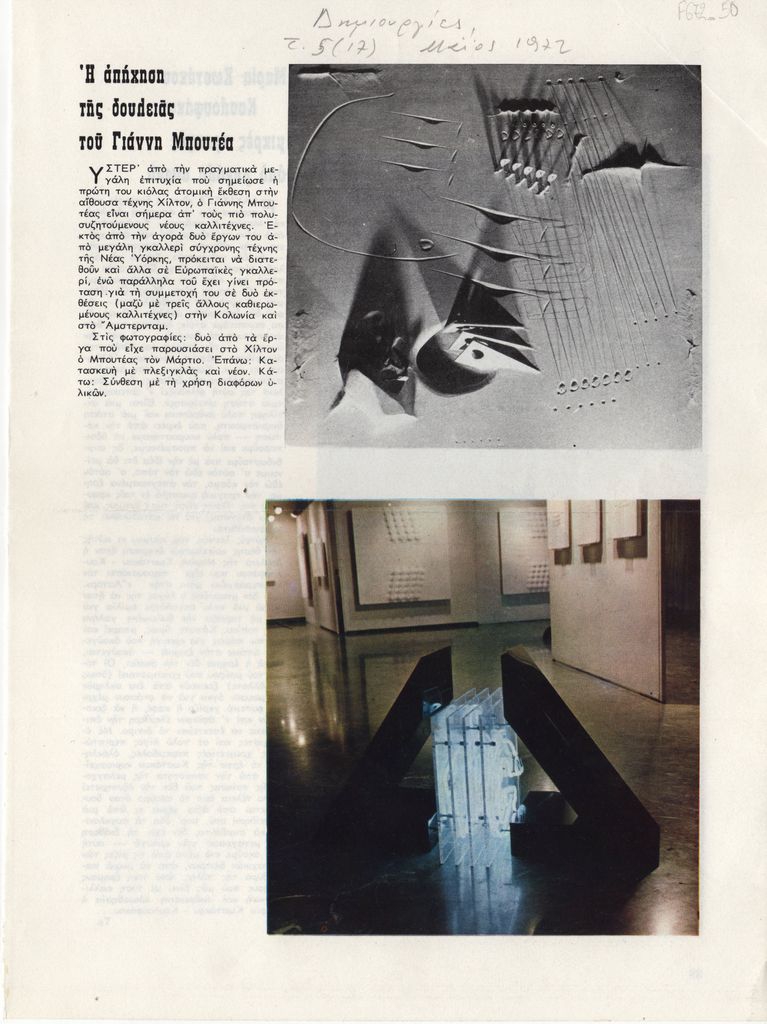 Απόκομμα, έντυπο, χαρτί ιλουστρασιόν, 28×20,5 εκ., όπου δημοσιεύεται, στα ελληνικά, σύντομο άρθρο που αφορά τον απόηχο της ατομικής έκθεσης έργων του Γιάννη Μπουτέα στην Αθήνα τον Μάρτιο του 1972. Στην πίσω όψη, άρθρο με τίτλο “Μαρία Κωστάκου-Κουλουφάκου: μικρές κραυγές από μεγάλη σιωπή”. Επάνω, επιγραφή με τα στοιχεία της δημοσίευσης.