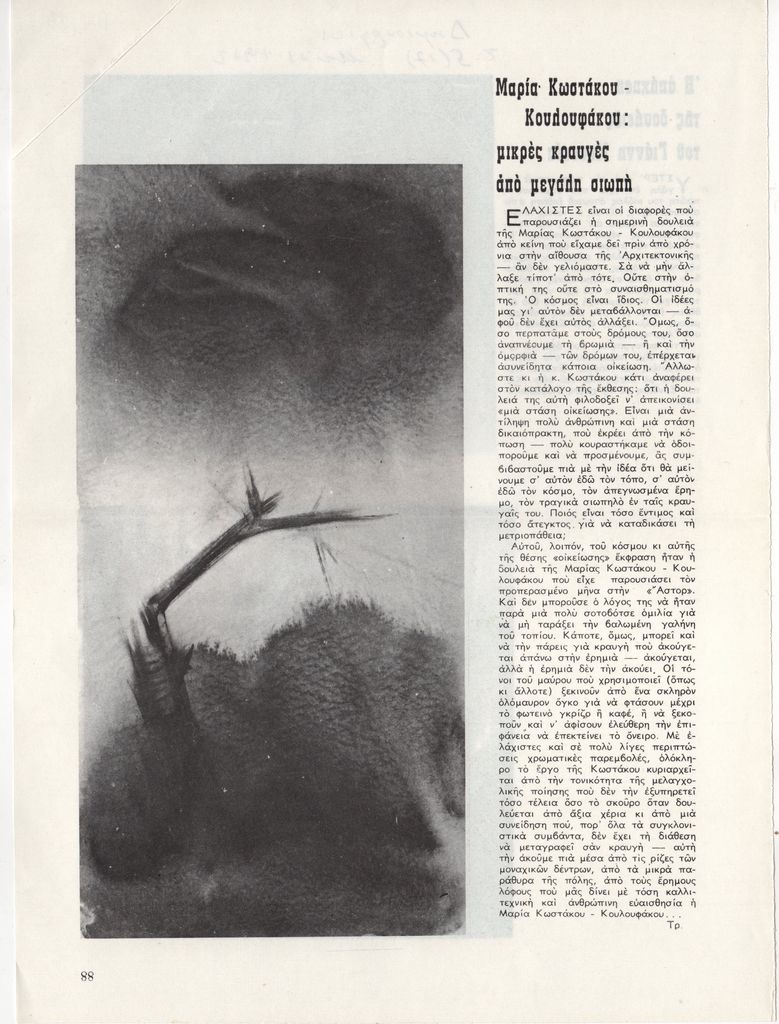 Απόκομμα, έντυπο, χαρτί ιλουστρασιόν, 28,2×20,7 εκ., όπου δημοσιεύεται, στα ελληνικά, κριτική ατομικής έκθεσης έργων της Μαρίας Κωστάκου-Κουλουφάκου στην Αθήνα τον Μάρτιο του 1972. Στην άλλη όψη, άρθρο με τίτλο “Η απήχηση της δουλειάς του Γιάννη Μπουτέα”