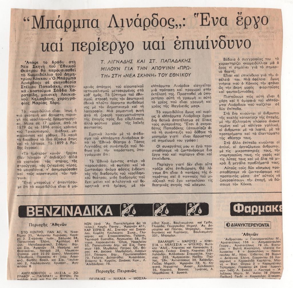 Απόκομμα, έντυπο, χαρτί, 20,2×20,4 εκ., στα ελληνικά, όπου δημοσιεύεται συνέντευξη του Τ. Λιγνάδη και του Στ. Παπαδάκη για την παραγωγή της Νέας Σκηνής του Εθνικού Θεάτρου του κωμειδύλλιου του Δημητρίου Κόκκου “Ο Μπάρπα Λινάρδος”. Στην άλλη όψη άρθρο της Ν. Λοϊζίδη για τον Γ. Μπουτέα.
