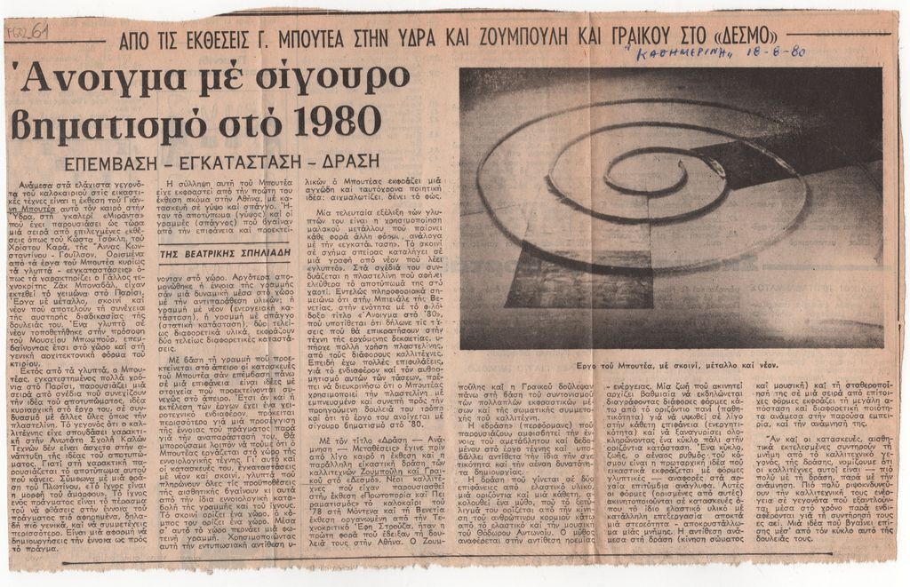 Απόκομμα, έντυπο, χαρτί, 19×30,5 εκ., όπου δημοσιεύεται, στα ελληνικά κριτική της Β. Σπηλιάδη για την ατομική έκθεση έργων του Γιάννη Μπουτέα στην Γκαλερί “Μιράντα” στην Ύδρα το 1980. Στο ίδιο κείμενο περιλαμβάνεται επίσης κριτική της παράλληλης εικαστικής δράσης των καλλιτεχνών Ζουμπούλη και Γραικού με τίτλο “Δράση – Ανάδραση – Μεταθέσεις” στην γκαλερί “Δεσμός”. Εικονογραφείται με α/μ αναπαραγωγή έργου του Γ. Μπουτέα. Επάνω, χειρόγραφη επιγραφή με τα στοιχεία δημοσίευσης.