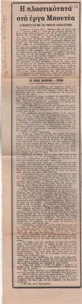 Απόκομμα, έντυπο, χαρτί, 44×11,5 εκ., στα ελληνικά, όπου δημοσιεύεται συνέντευξη του Γ. Μπουτέα στην Ντ. Ηλιοπούλου Ρογκάν. Αριστερά, επιγραφή με τα στοιχεία της δημοσίευσης.