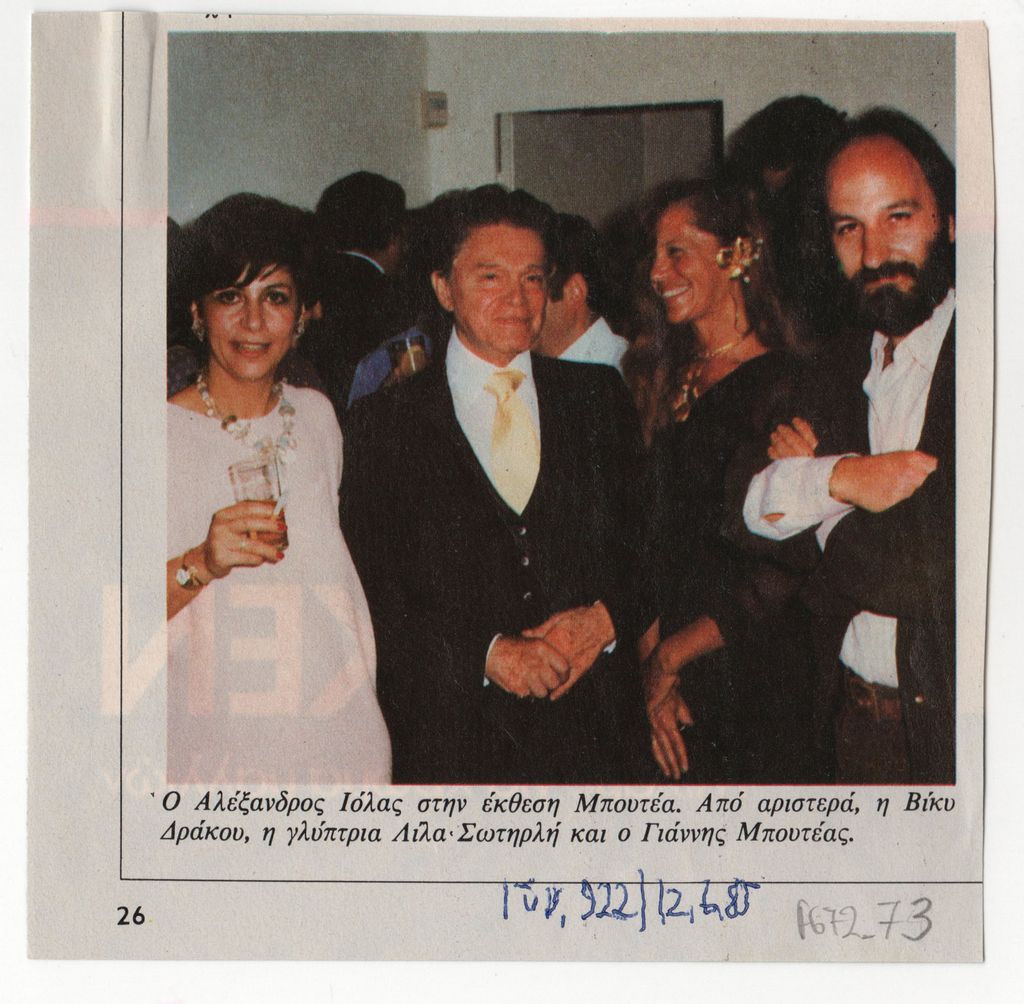 Απόκομμα, έντυπο, χαρτί ιλουστρασιόν, 11,5×11,5 εκ., όπου δημοσιεύεται, στα ελληνικά, αναπαραγωγή φωτογραφίας από τα εγκαίνια της ατομικής έκθεσης έργων του Γιάννη Μπουτέα στο Dracos Art Center το 1985.