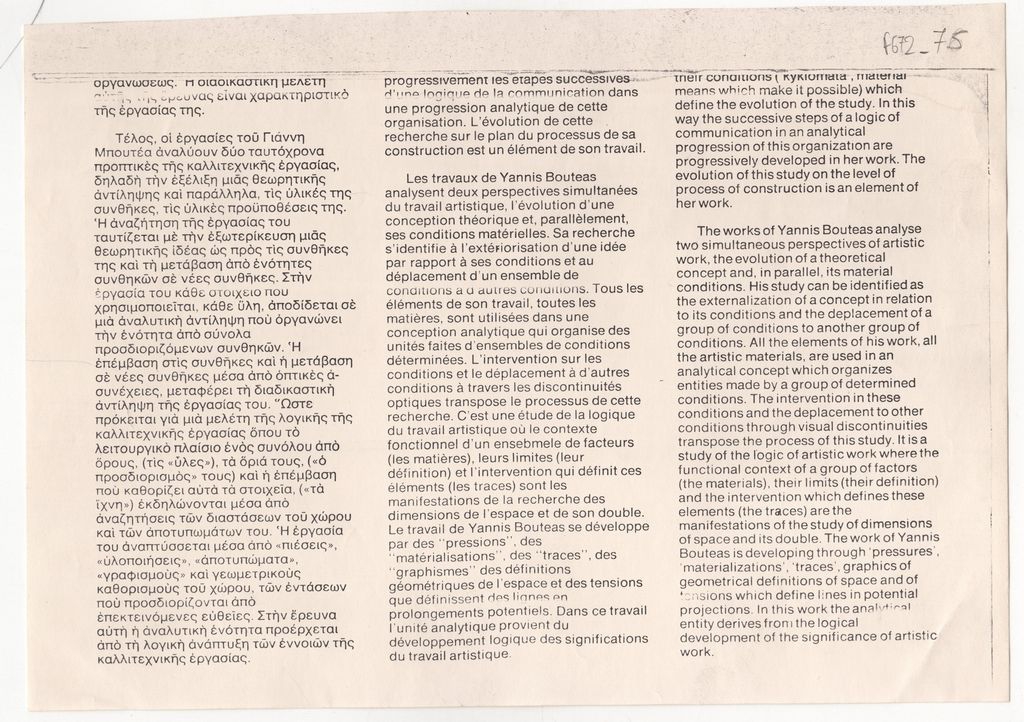 Φωτοαντίγραφο αποκόμματος εντύπου, χαρτί, 15,0×21,0 εκ., όπου δημοσιεύεται κείμενο, στα ελληνικά, γαλλικά και αγγλικά, κείμενο για το έργο του Γιάννη Μπουτέα.