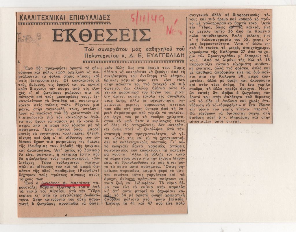 Απόκομμα εφημερίδας, χαρτί, 11,5×14,4 εκ. (ακανόνιστο σχήμα), όπου δημοσιεύεται, στα ελληνικά, κριτική της ατομικής έκθεσης του Δήμου Μπραέσσα στην Αθήνα το 1949. Επάνω, επιγραφή με τα στοιχεία της δημοσίευσης.