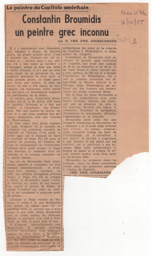 Απόκομμα, έντυπο, χαρτί, 22,2×13,0 εκ., όπου δημοσιεύεται, στα γαλλικά, άρθρο του Χρήστου Εμμ. Μαυρομάτη για την διακόσμηση του αμερικανικού καπιτωλίου από τον Κωνσταντίνο Μπρουμίδη. Επάνω, επιγραφή με τα στοιχεία της δημοσίευσης.