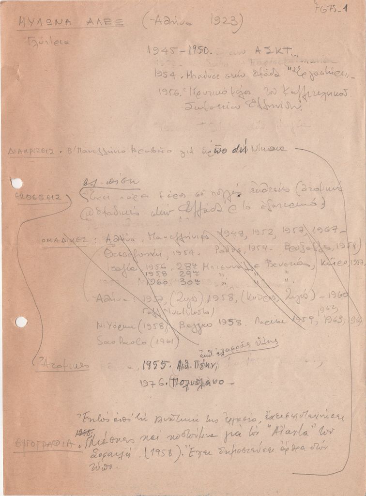 Κείμενο, στα ελληνικά, χειρόγραφο, με μολύβι, σε χαρτί, 28,5×21,5 εκ., 2 φφ., όπου καταγράφονται βιογραφικά στοιχεία για τη γλύπτρια Άλεξ Μυλωνά. Περιλαμβάνονται στοιχεία για την καλλιτεχνική της πορεία, διακρίσεις, εκθέσεις και εργογραφία.