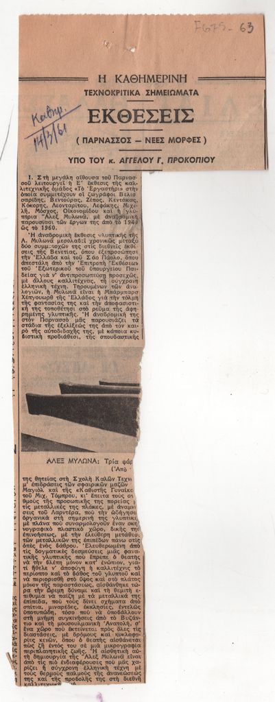 Αποκόμματα, έντυπα, χαρτί, 2 τμήματα, 27,0×10,0 (ακανόνιστο σχήμα) και 10,3×9,5 εκ., όπου δημοσιεύεται, στα ελληνικά, κριτική του Άγγελου Προκοπίου για την Ε’ ομαδική έκθεση της καλλιτεχνικής ομάδας “Το Εργαστήρι” στην Αθήνα τον Μάρτιο του 1961. Επάνω, επιγραφή με τα στοιχεία της δημοσίευσης.