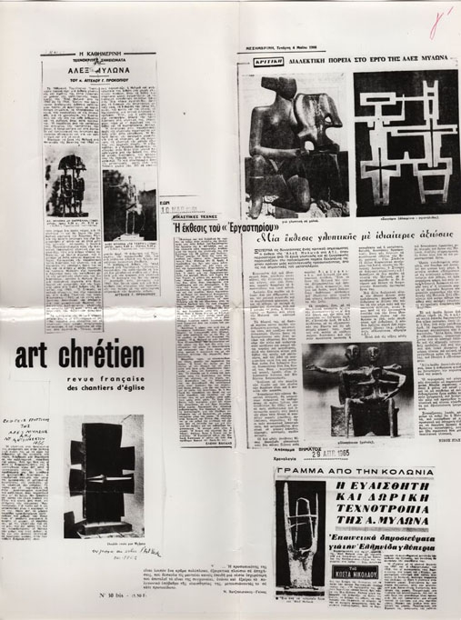 Φωτογραφία, α/μ, φωτογραφικό χαρτί, 40,0×30,4 εκ. Κολάζ αποκομμάτων από τον ελληνικό και ξένο τύπο όπου δημοσιεύονται κριτικές για την γλύπτρια Άλεξ Μυλωνά. Περιλαμβάνονται τα άρθρα: Άγγελος Γ. Προκοπίου “‘Αλεξ Μυλωνά”, Ντ. Αντωνακάτου “Έκθεσις γλυπτικής της Άλεξ Μυλωνά Α.Τ.Ι. “, Ελένη Βακαλό, “Η έκθεσις του ‘Εργαστηρίου'”, Νίκος Ζίας, “Μία έκθεσις γλυπτικής με ιδιαίτερες αξιώσεις”, Κώστα Νικολάου “Η ευαίσθητη και δωρική τεχνοτροπία της Α. Μυλωνά”. Τα δημοσιεύετα καλύπτουν την περίοδο 1961-1965.