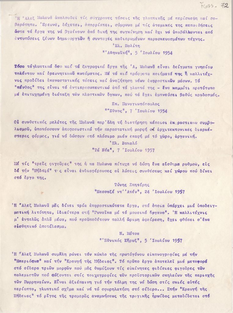 Κείμενο, δακτυλόγραφη, στα ελληνικά, χαρτί, 29,0×21,5 εκ., 3 φφ, μίας όψης. Αποδελτίωση αποσπασμάτων κριτικών από τον ελληνικό και διεθνή τύπο της περιόδου 1954-1959 για την γλύπτρια Άλεξ Μυλωνά.