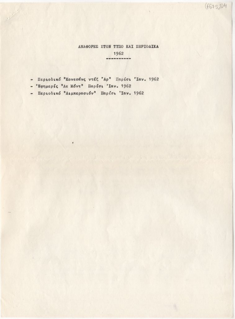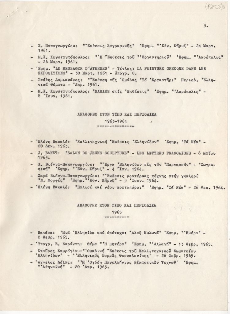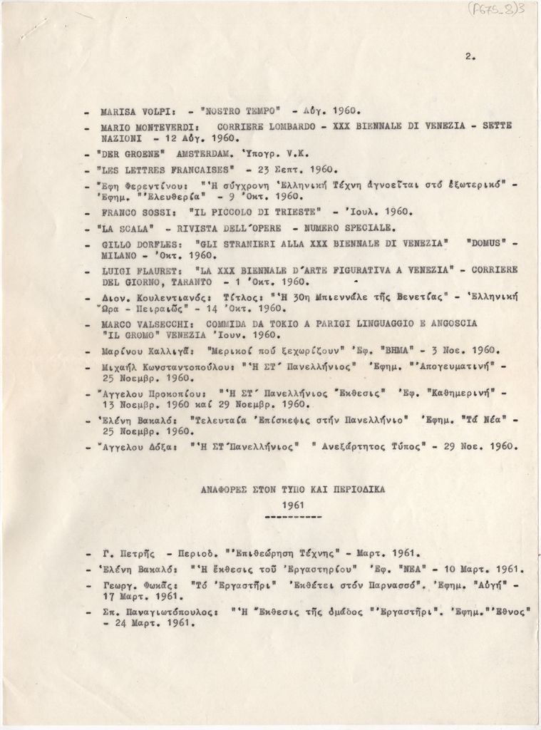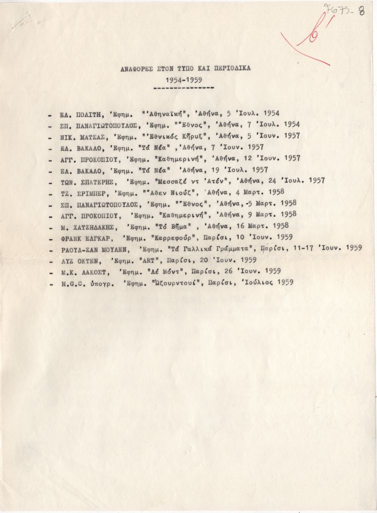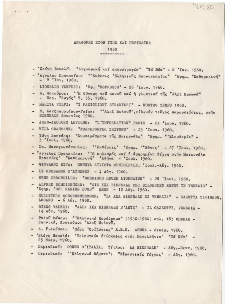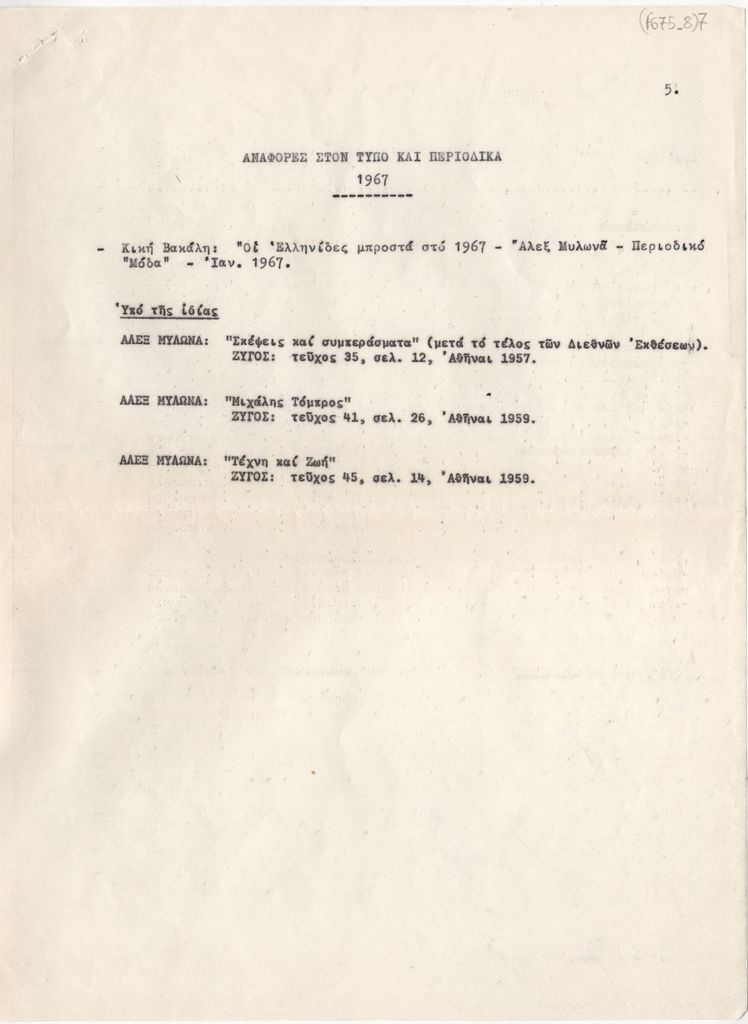 Κείμενο, δακτυλόγραφο, στα ελληνικά, χαρτί, 29,0×21,3 εκ, 7 φφ μίας όψης. Κατάλογος δημοσιευμάτων για την Άλεξ Μυλωνά στο ημερήσιο και περιοδικό τύπο. Καλύπτει την περίοδο 1954-1967. Επάνω δεξιά, επιγραφή.