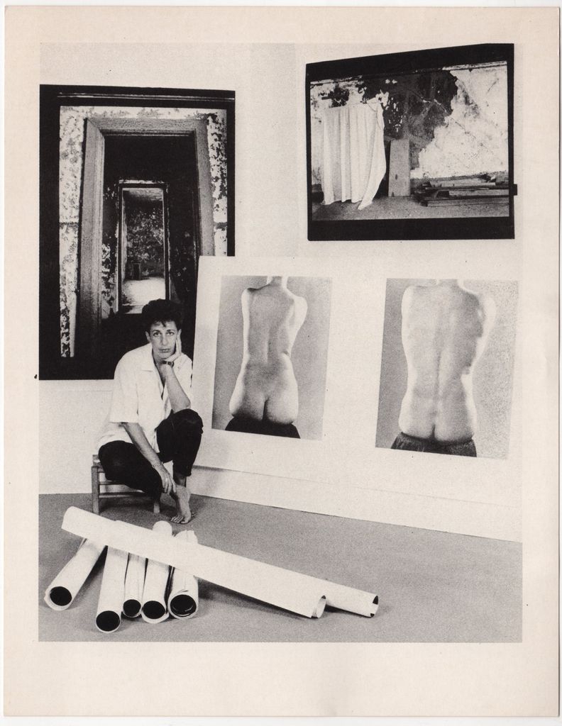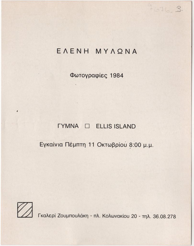 Πρόσκληση της ατομικής έκθεσης φωτογραφίας «Ελένη Μυλωνά. Φωτογραφίες 1984. Γυμνά. Ellis island» στην 1984. Στην μία όψη εικονογράφηση.