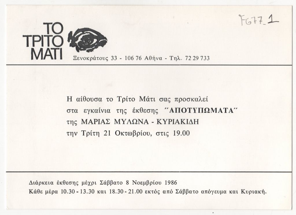 Έντυπο, στα ελληνικά, μονόφυλλο, χαρτόνι, 12,2×17,1 εκ. Πρόσκληση εγκαινίων της ατομικής έκθεσης έργων της Μαρίας Μυλωνά-Κυριακίδη με τίτλο «Αποτυπώματα» στην γκαλερί “Το Τρίτο Μάτι” στην Αθήνα τον Οκτώβριο του 1986.
