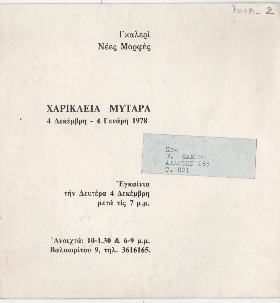Έντυπο, στα ελληνικά, μονόφυλλο, χαρτόνι, 19,0×18,3 εκ. Πρόσκληση της ατομικής έκθεσης ζωγραφικής της Χαρίκλειας Μυταρά στην Αθήνα τον Δεκέμβριο του 1977. Στη μία όψη, εικονογράφηση. Στην άλλη όψη επικολλημένη ετικέτα με τα στοιχεία του ζεύγους Σπητέρη ως παραλήπτη.