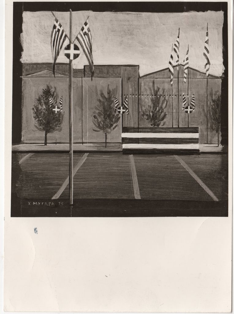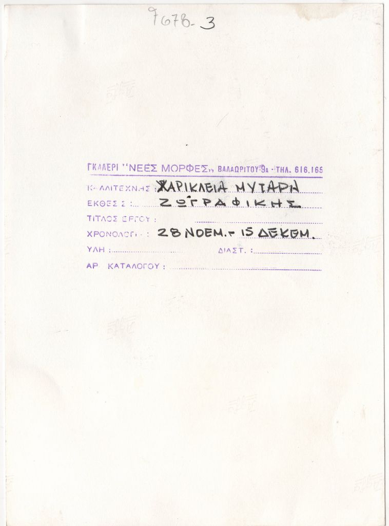 Φωτογραφία, α/μ, σε φωτογραφικό χαρτί, 17,7×13,0 εκ. Αναπαραγωγή έργου της Χαρίκλειας Μυταρά. Στην πίσω όψη, σφραγίδα της Γκαλερί Νέες Μορφές με χειρόγραφα συμπληρωμένα τα στοιχεία του έργου.