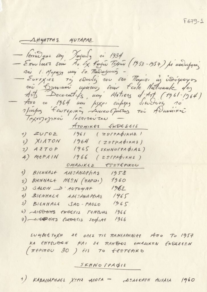 Βιογραφικό, χειρόγραφο με μαύρο μελάνι, στα ελληνικά, χαρτί, 2 φφ, 28,5×21 εκ., του Δημήτρη Μυταρά. Περιέχει σπουδές, καλλιτεχνική δραστηριότητα, εκθέσεις, σκηνογραφική δραστηριότητα και διακρίσεις.