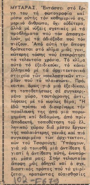 Απόκομμα εφημερίδας όπου δημοσιεύεται κριτική για το εικαστικό έργο του Δημήτρη Μυταρά.