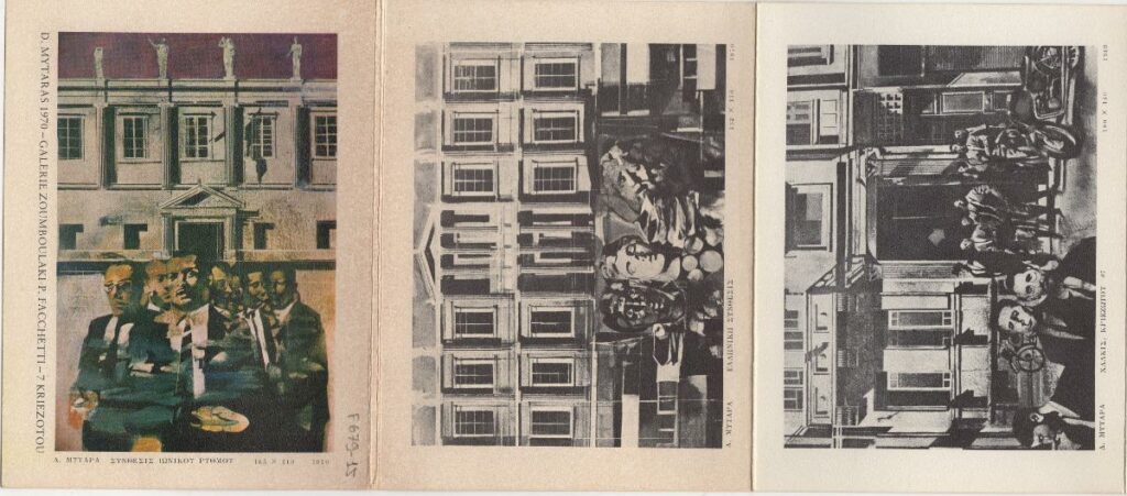 Έντυπο ατομικής έκθεσης του Δημήτρη Μυταρά στην Γκαλερί Ζουμπουλάκη στην Αθήνα. Περιέχει βιογραφικό του καλλιτέχνη και εικονογράφηση.