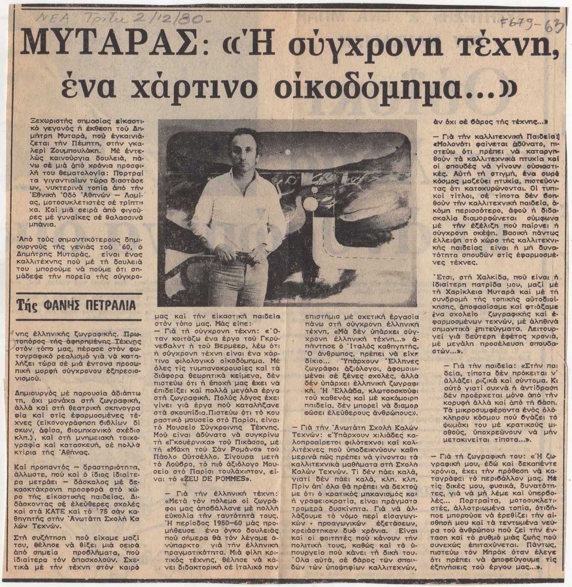 Απόκομμα της εφημερίδας “Τα Νέα” δημοσίευσης κριτικής έκθεσης του Δημήτρη Μυταρά, η οποία διεξάγεταισ την Γκαλερί Ζουμπουλάκη, στην Αθήνα. Δίνονται αποσπάσματα κρίσεων του καλλιτέχνη για τη νεοελληνική ζωγραφική, για την ΑΣΚΤ, για την καλλιτεχνική παιδεία στην Ελλάδα και για την Τέχνη του.