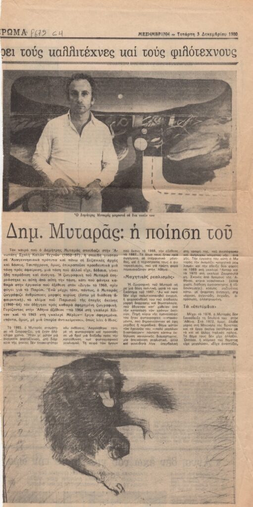 Απόκομμα της εφημερίδας “Μεσημβρινή” (03/12/1980) δημοσίευσης άρθρου αφιερωμένου στον Δημήτρη Μυταρά.