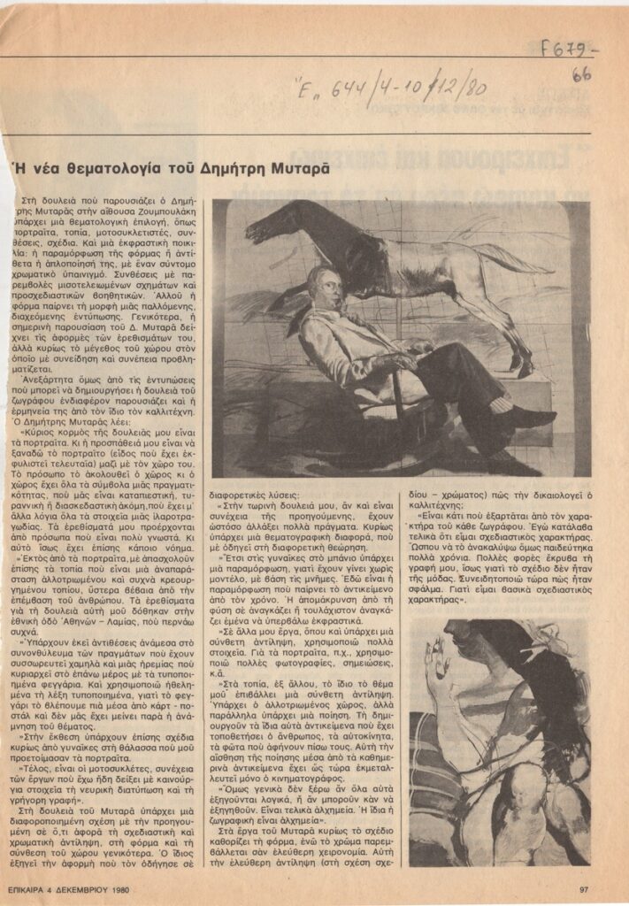 Απόκομμα του περιοδικού “Επίκαιρα” (04/12/1980) δημοσίευσης κριτικής έκθεσης του Δημήτρη Μυταρά, η οποία διεξάγεται στην Γκαλερί Ζουμπουλάκη, στην Αθήνα.