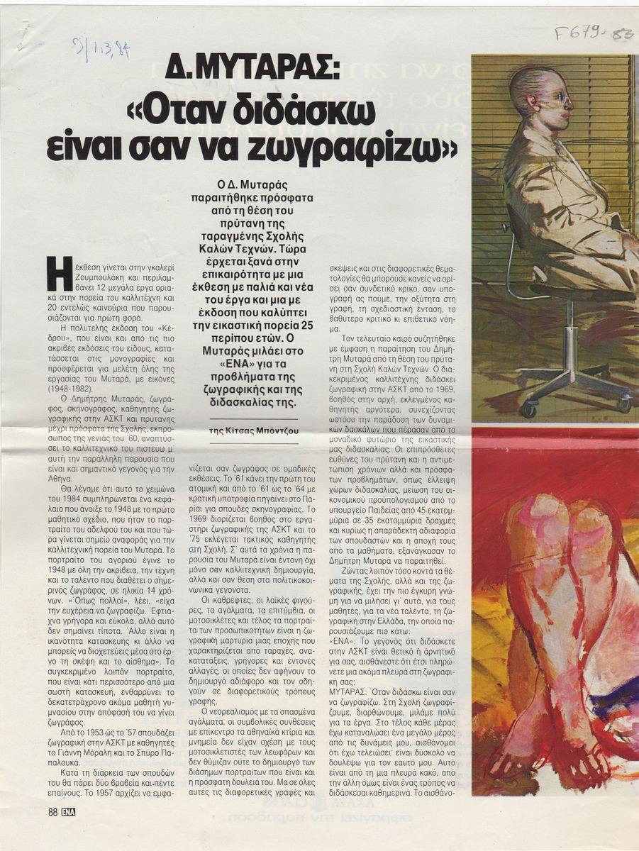 Απόκομμα του περιοδικού “Ένα” (01/03/1984), όπου δημοσιεύεται συνέντευξη του Δημήτρη Μυταρά. Ο καλλιτέχνης μιλά για το έργο που παρουσιάζει σε ατομική του έκθεση στην γκαλερί Ζουμπουλάκη στην Αθήνα, στη θητεία του στη θέση του καθηγητή και πρύτανη στην ΑΣΚΤ και την παραίτησή του από την θέση λόγω των προβλημάτων αυτής.