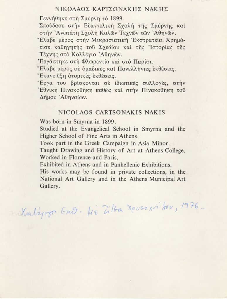 Απόκομμα, χαρτόνι, 23×17 εκ., στα ελληνικά, ομαδικής έκθεσης των Νικόλαου Καρτσωνάκη-Νάκη και Τίτσας Χρυσοχοϊδη. Δίνεται το βιογραφικό σημείωμα του πρώτου σε ελληνικά και σε αγγλική μετάφραση.