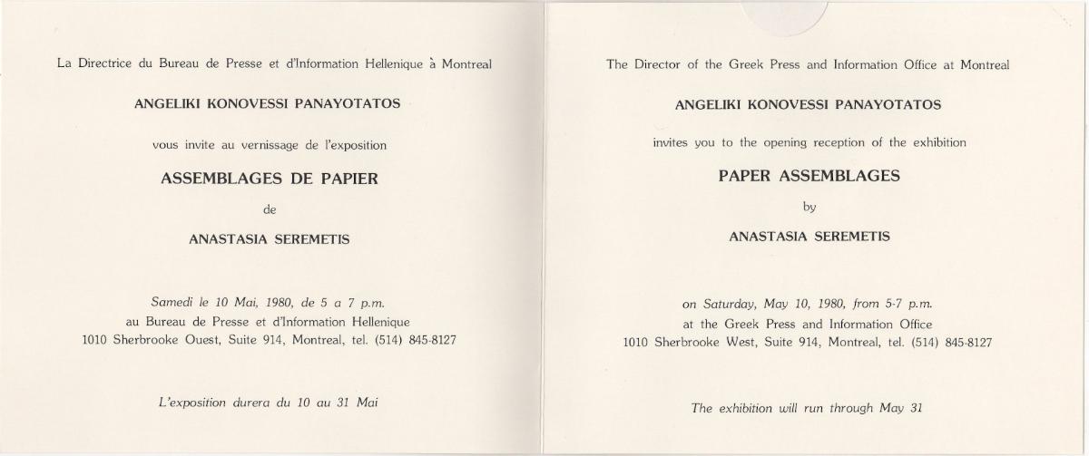Πρόσκληση, στα γαλλικά και αγγλικά, χαρτόνι, δίπτυχο 13×15 εκ. Πρόσκληση της ατομικής έκθεσης έργων της Αναστασίας Νεδέλκου-Σερεμέτη στο Μόντρεαλ.