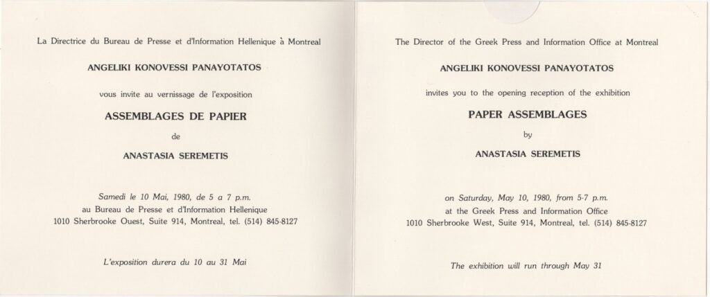 Νεδέλκου-Σερεμέτη Αναστασία "Paper Assemblages by Anastasia Seremetis", Bureau de Presse et d'Information Hellenique, Μόντρεαλ, 10/05/1980 - 31/05/1980