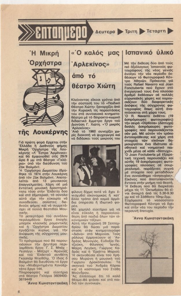 Απόκομμα, χαρτί, 22×13.5 εκ., στα ελληνικά, δημοσίευσης κριτικής έκθεσης του Νέστορα (Παπανικολόπουλου), η οποία διεξάγεται στην Γκαλερί Νέες Μορφές στην Αθήνα.