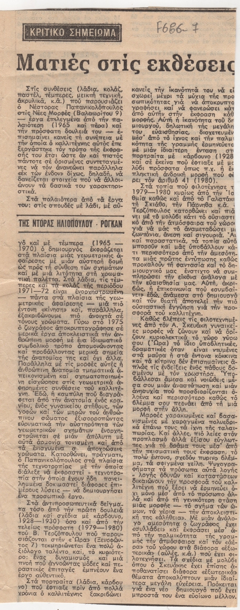 Απόκομμα, χαρτί, 26,5×11 εκ., στα ελληνικά, δημοσίευσης κριτικής έκθεσης του Νέστορα (Παπανικολόπουλου), η οποία διεξάγεται στην γκαλερί Νέες Μορφές στην Αθήνα.