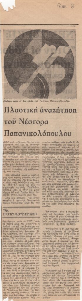 Απόκομμα, χαρτί, 38×10,5 εκ., στα ελληνικά, δημοσίευσης κριτικής έκθεσης του Νέστορα Παπανικολόπουλου, η οποία διεξάγεται στην Γκαλερί Νέες Μορφές στην Αθήνα.