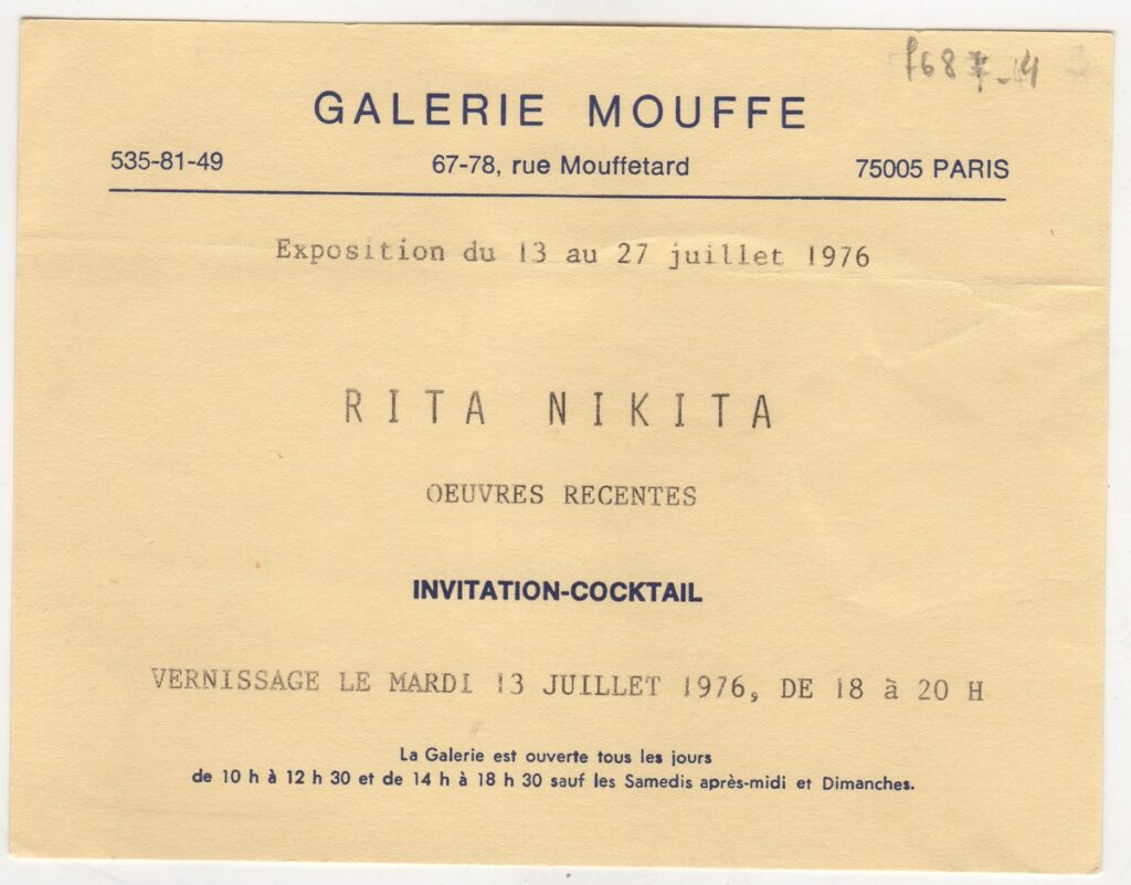 Πρόσκληση, χαρτόνι, 10,5×14 εκ., στα γαλλικά, εγκαινίων ατομικής έκθεσης ζωγραφικής της Ρίτας Νικήτα.