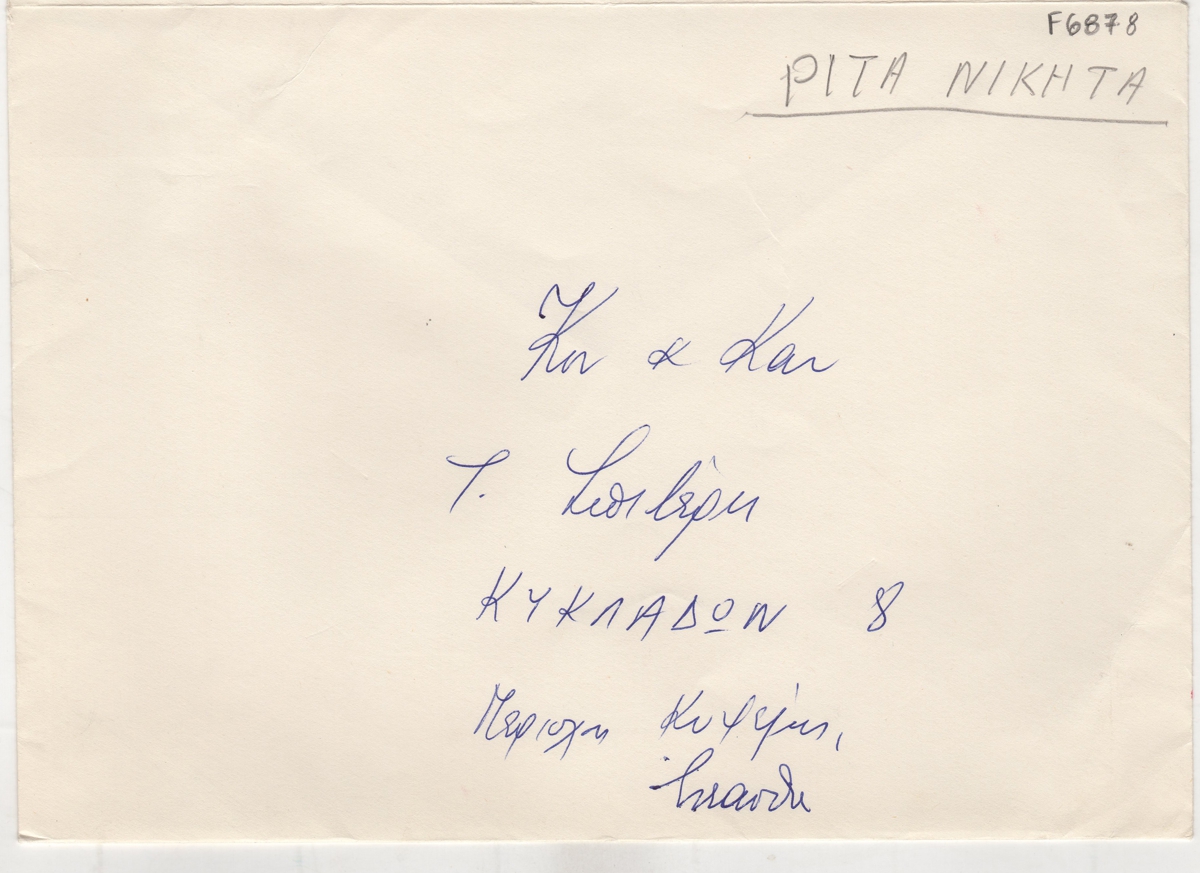 Φάκελος, χαρτί, 16,5×23 εκ., με αναγραφόμενη σε χειρόγραφη μορφή τη διεύθυνση του ζεύγους Σπητέρη στην Αθήνα.