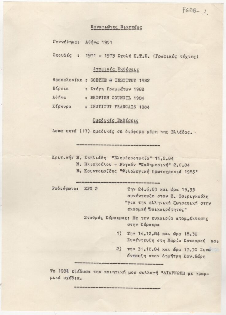 Βιογραφικό, δακτυλόγραφο, χαρτί, 29.5×21 εκ., στα ελληνικά, του Παναγιώτη Νικητέα. Περιέχει σπουδές, εκθέσεις κριτικές, συνεντεύξεις.
