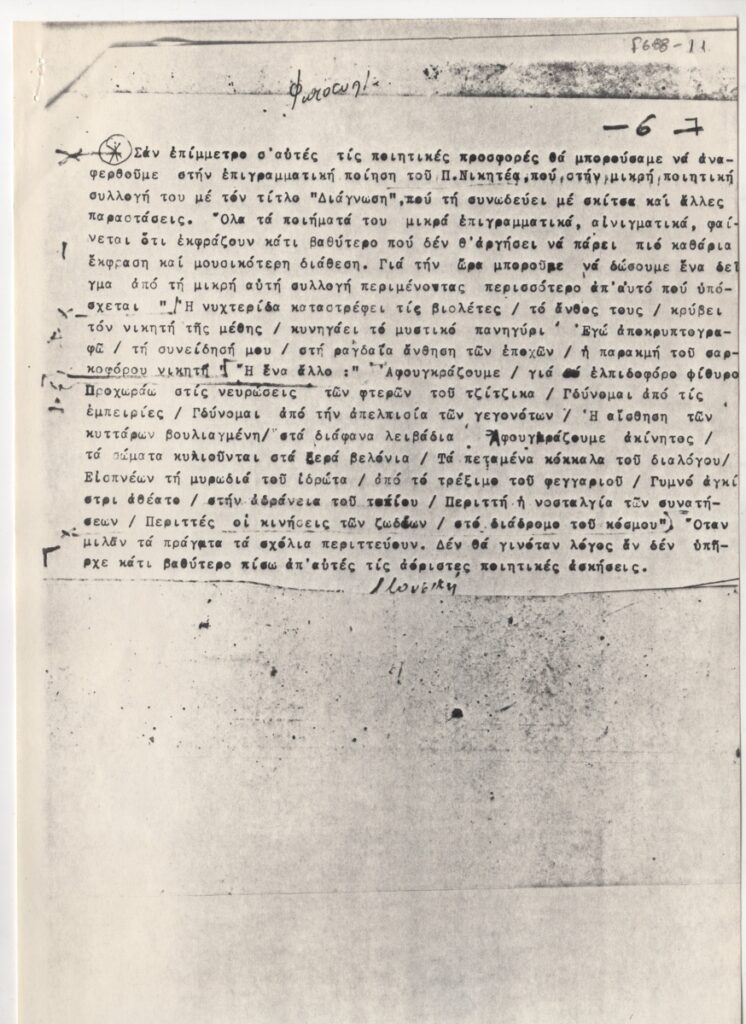 Φωτοαντίγραφο, χαρτί, 30×21 εκ., στα ελληνικά, δημοσίευσης κριτικής του Γιώργου Βαλέτα για την ποιητική συλλογή του Παναγιώτη Νικητέα στην εκπομπή το “Ελληνικό Βιβλίο” στο Α’ πρόγραμμα ραδιοφωνίας της ΕΡΤ.