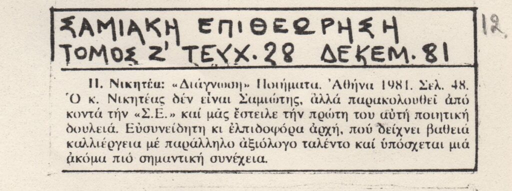 Απόκομμα, χαρτί, 29,5×21 εκ., στα ελληνικά, δημοσίευσης άρθρου αναφερόμενου στην κυκλοφορία ποιητικής συλλογής του Παναγιώτη Νικητέα με τίτλο “Διάγνωση”.