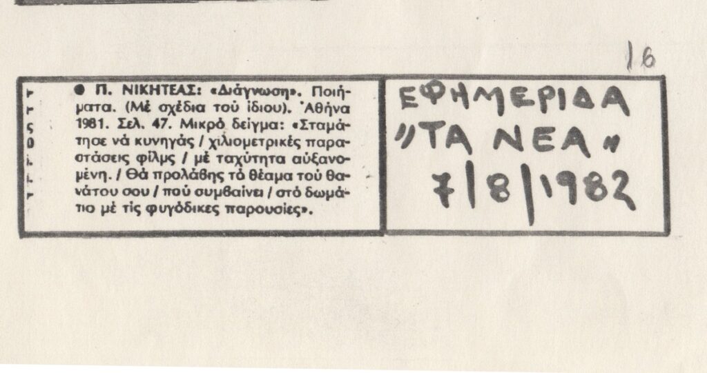 Απόκομμα, χαρτί, 29.5×21 εκ., στα ελληνικά, δημοσίευσης αποσπάσματος από την ποιητική συλλογή του Παναγιώτη Νικητέα με τίτλο “Διάγνωση”.