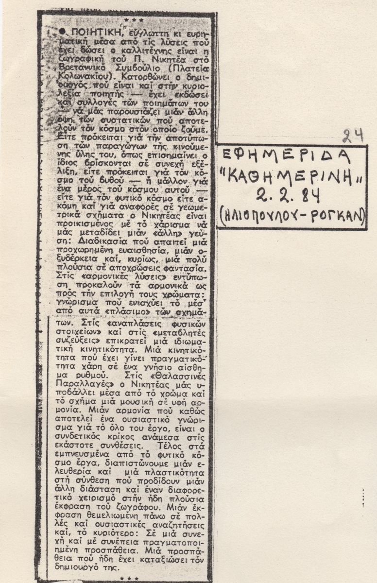 Απόκομμα, χαρτί, 29.5×21 εκ., στα ελληνικά, δημοσίευσης κριτικής έκθεσης του Παναγιώτη Νικητέα, η οποία διεξάγεται στο Βρετανικό Συμβούλιο Αθηνών.