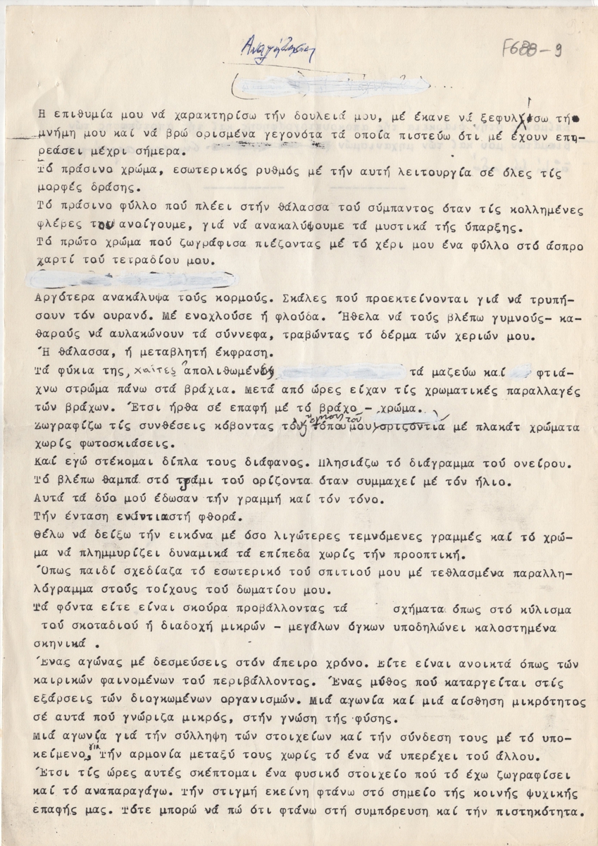 Κείμενο, δακτυλόγραφο, χαρτί διπλής όψης, 29,5×21 εκ., στα ελληνικά, του Παναγιώτη Νικητέα για το έργο του.