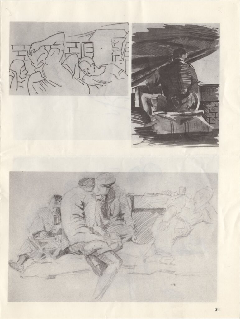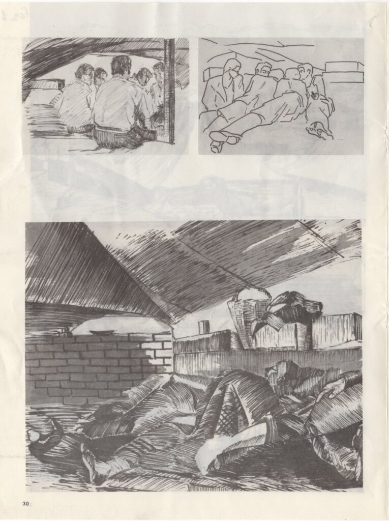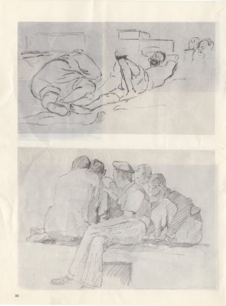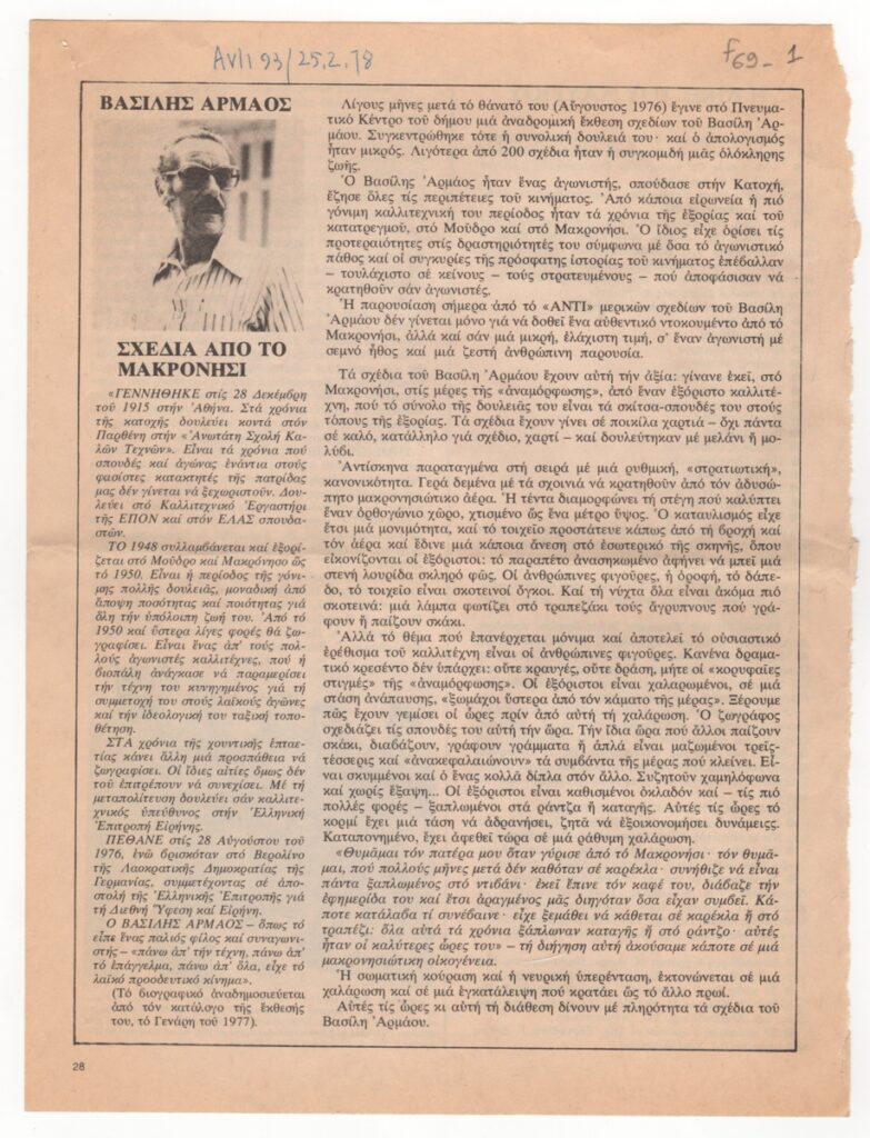 Αποκόμματα εντύπων, χαρτί και χαρτί ιλουστρατιόν, 28,0×21,2 εκ., όπου δημοσιεύεται, στα ελληνικά, συνοπτική παρουσίαση του έργου του Βασίλη Αρμάου. Γίνεται αναφορά σε αναδρομική έκθεση σχεδίων του στην Αθήνα το 1976. Επάνω, επιγραφή με τα στοιχεία της δημοσίευσης. Στην πίσω σελίδα άρθρο: “Η Δίκη του Λαυρίου”.