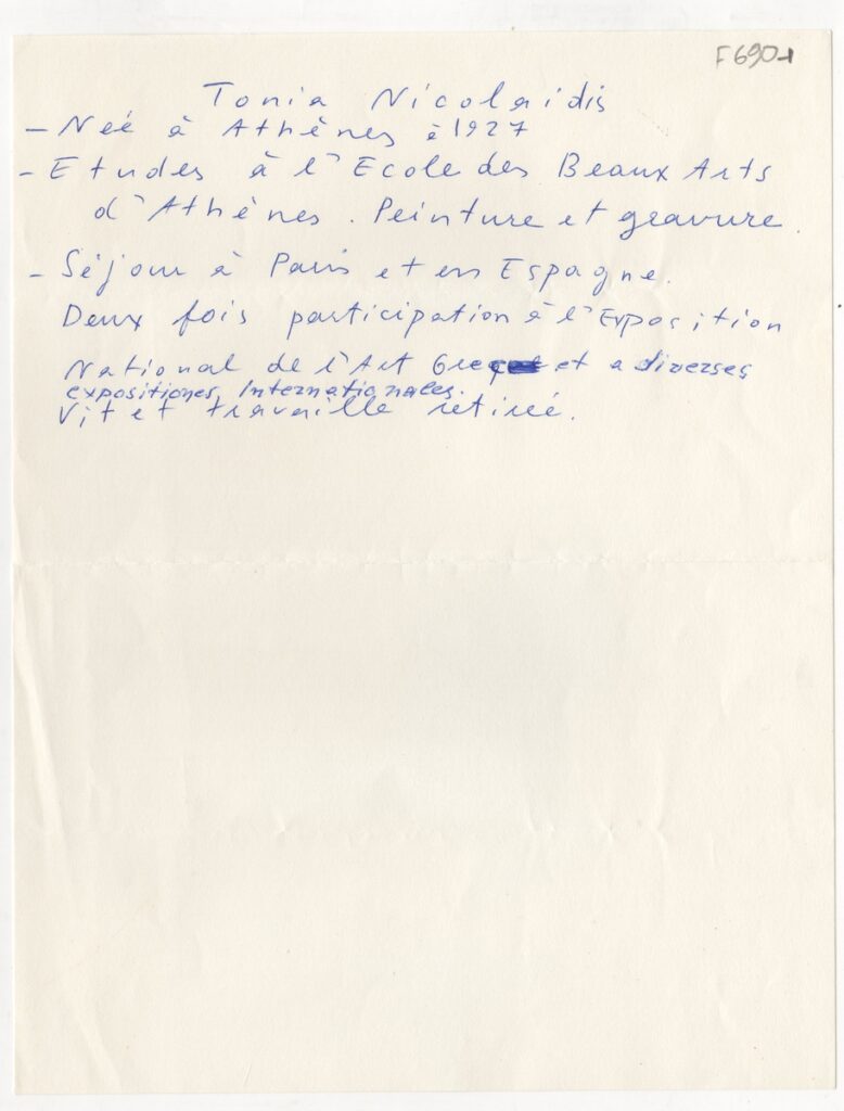 Βιογραφικό, χειρόγραφο με μπλε μελάνι, χαρτί, 22×17 εκ., στα γαλλικά, της Τόνιας Νικολαΐδου. Περιέχει επιγραμματικά σπουδές, μετακινήσεις και εκθέσεις.