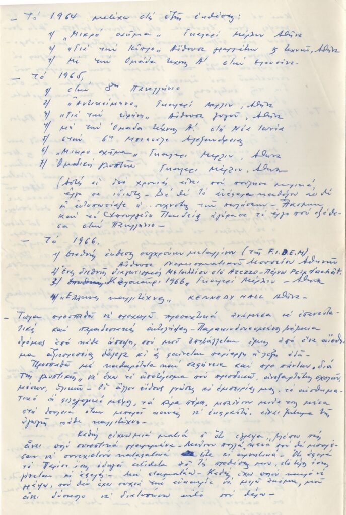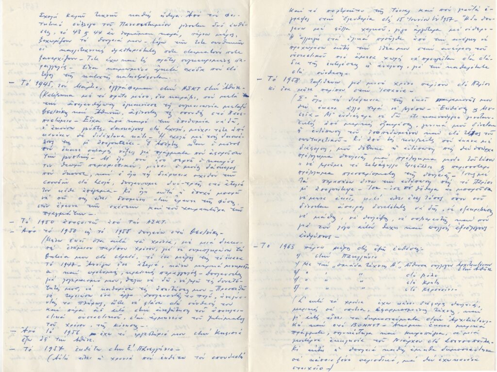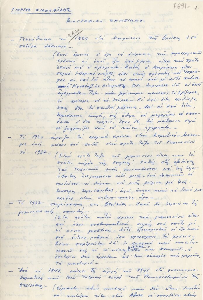 Βιογραφικό, χειρόγραφο με μπλε μελάνι, χαρτί, 2 φφ, 29,5×21 εκ., στα ελληνικά, του Γιώργου Νικολαΐδη. Πρόκεται για ιδιόγραφο του καλλιτέχνη στο οποίο παρουσιάζει αναλυτικά τις σπουδές, μετακινήσεις, εκθέσεις και δραστηριότητά του.