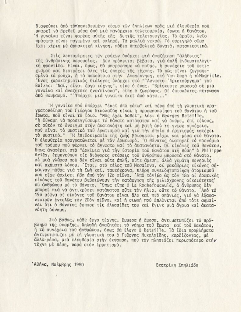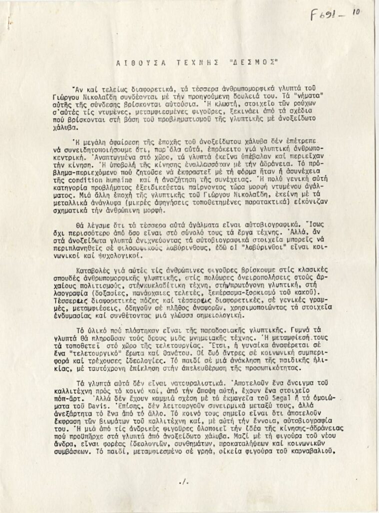 Δακτυλόγραφο κείμενο της Βεατρίκης Σπηλιάδη για το έργο του Γιώργου Νικολαΐδη που παρουσιάζει σε ατομική του έκθεση στην Αίθουσα Τέχνης Δεσμός.