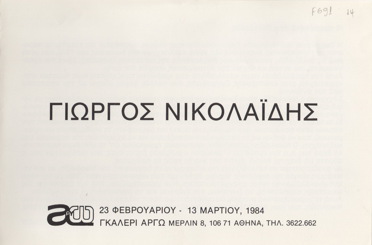 Έντυπο ατομικής έκθεσης ζωγραφικής του Γιώργου Νικολαΐδη στην Γκαλερί “Αργώ” στην Αθήνα. Περιέχει κείμενο του Νίκου Αλεξίου, σύντομο βιογραφικό σημείωμα και εικονογράφηση.