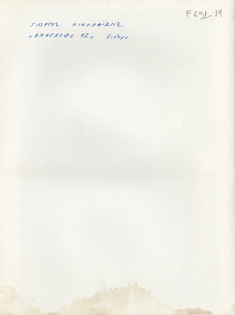 Ασπρόμαυρη τυπωμένη φωτογραφία, έργου του Γιώργου Νικολαΐδη. Φέρει επιγραφές στην πίσω όψη.