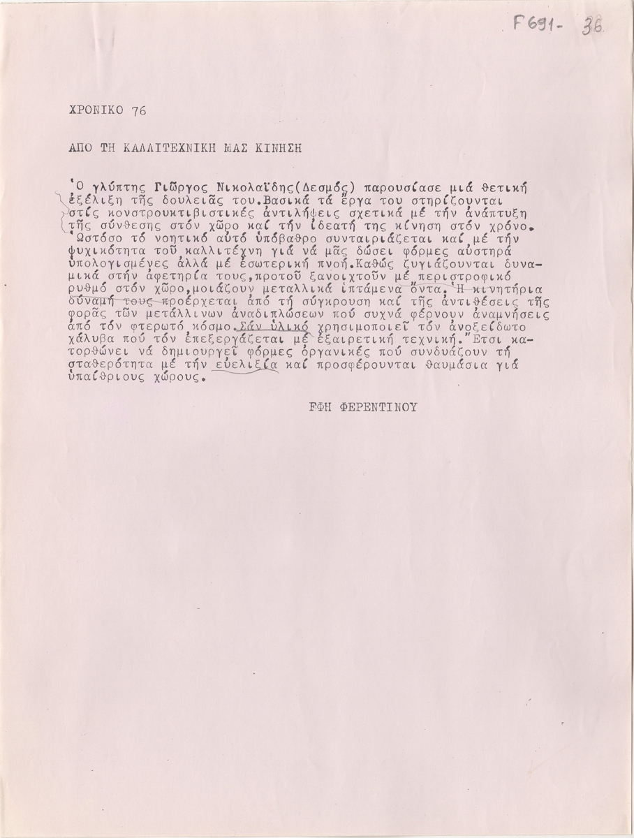 Φωτοαντίγραφο, δακτυλόγραφο, χαρτί, 28×21 εκ., στα ελληνικά, αποδελτίωσης κριτικής έκθεσης του Γιώργου Νικολαΐδη, η οποία διεξάγεται στην Αίθουσα Τέχνης Δεσμός στην Αθήνα.