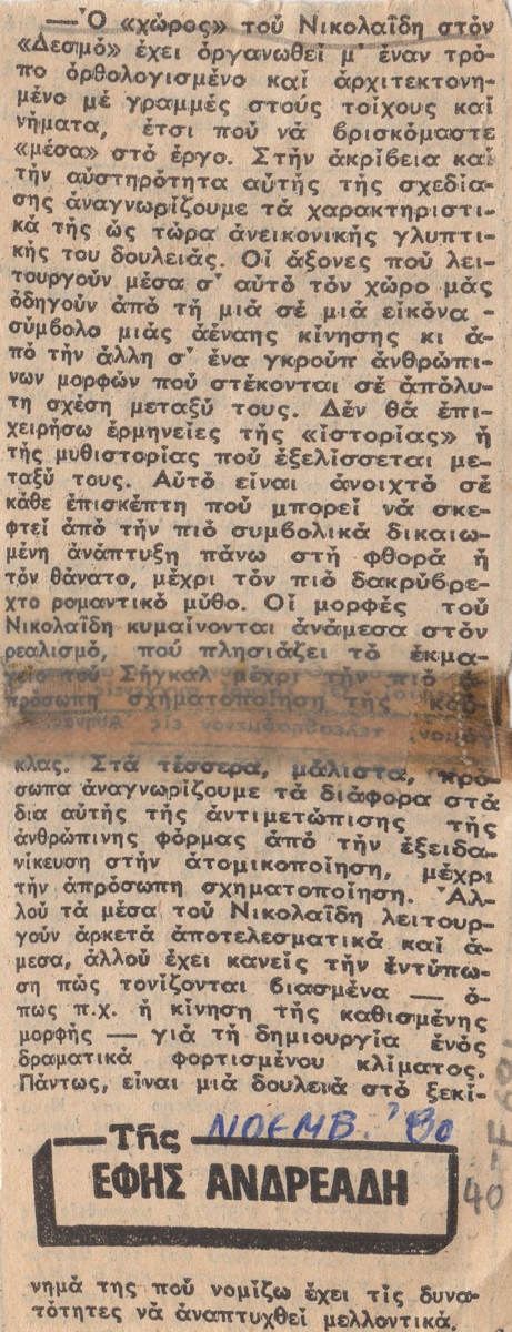 Απόκομμα, χαρτί, 14,5×5 εκ., στα ελληνικά, δημοσίευσης κριτικής έκθεσης του Γιώργου Νικολαΐδη, η οποία διεξάγεται στην Αίθουσα Τέχνης Δεσμός, στην Αθήνα.