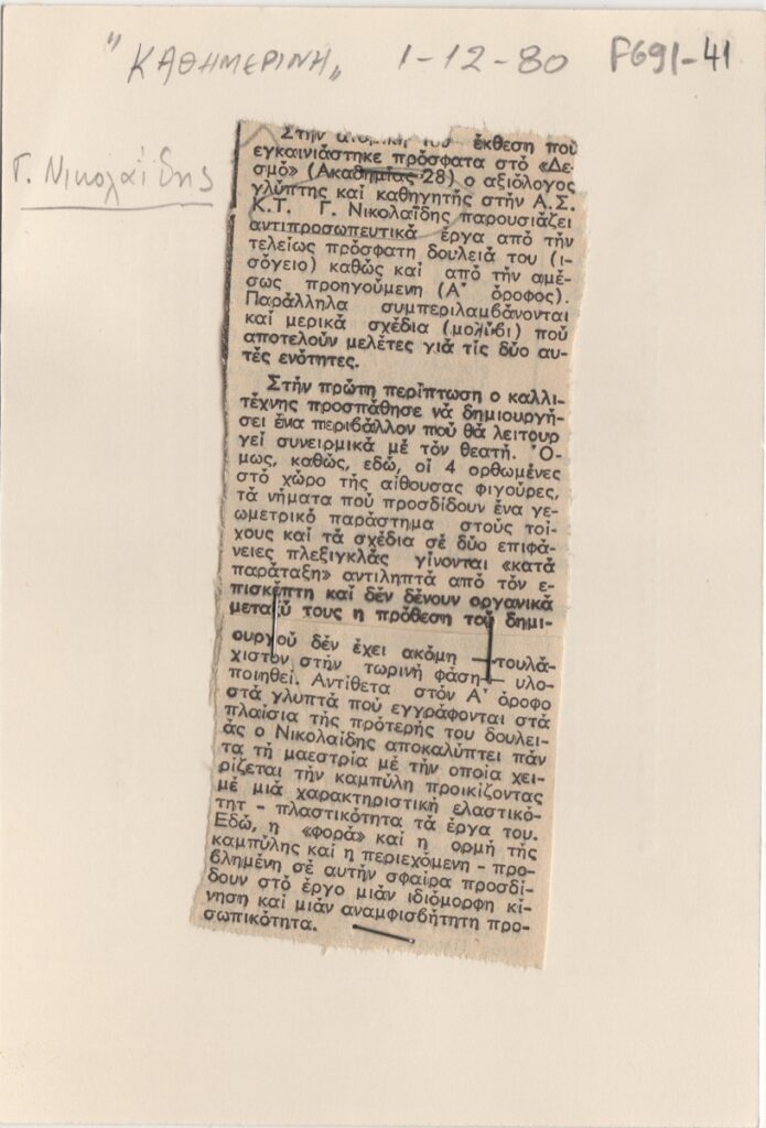 Απόκομμα, χαρτί συρραμμένο σε έντυπο συν. διαστ. 16×11 εκ., στα ελληνικά, δημοσίευσης κριτικής έκθεσης του Γιώργου Νικολαΐδη, η οποία διεξάγεται στην Αίθουσα Τέχνης Δεσμός στην Αθήνα.